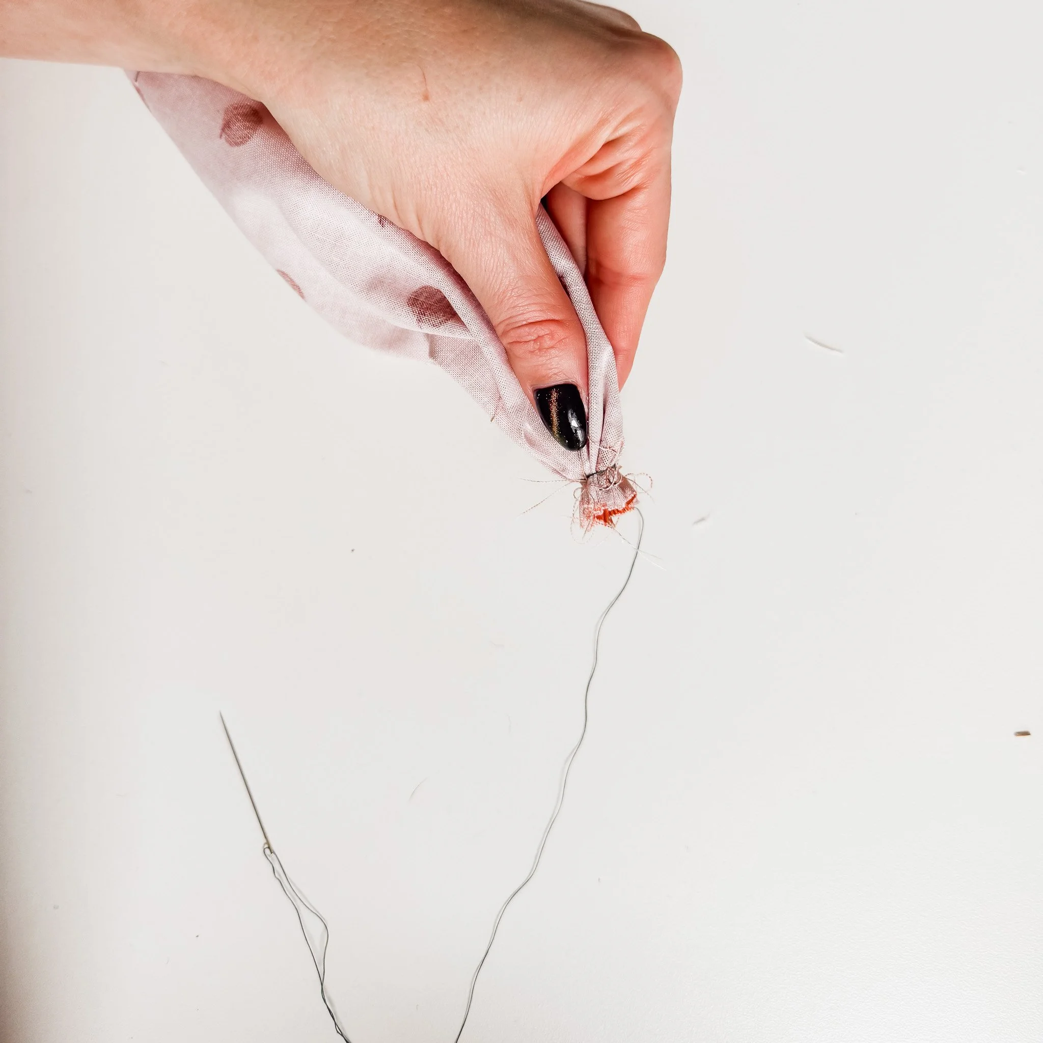 Stitch across the gathered area in an “X” to secure it, and wrap the thread around a few times.