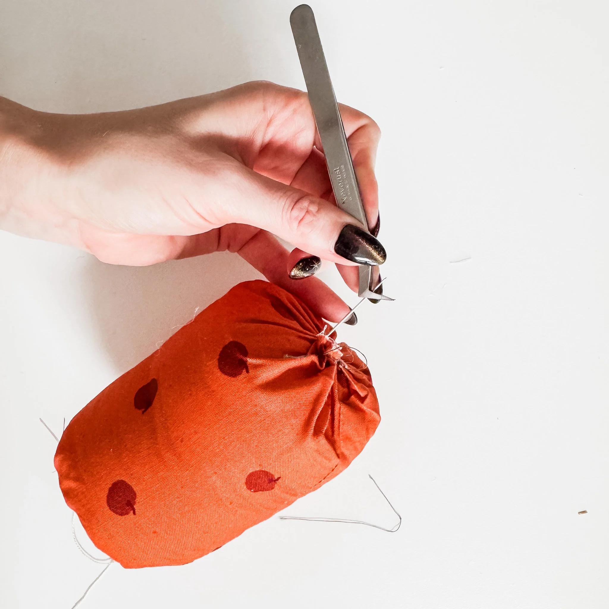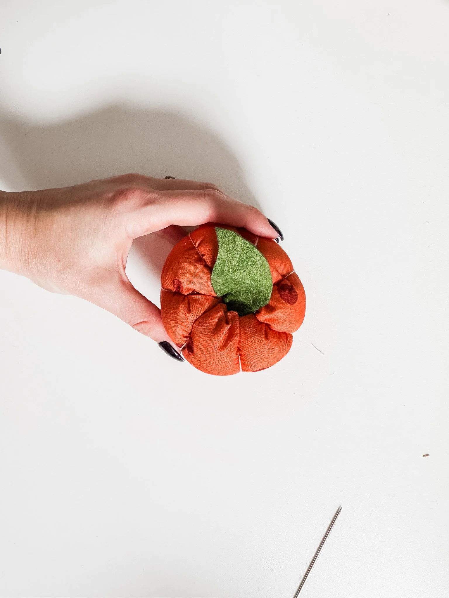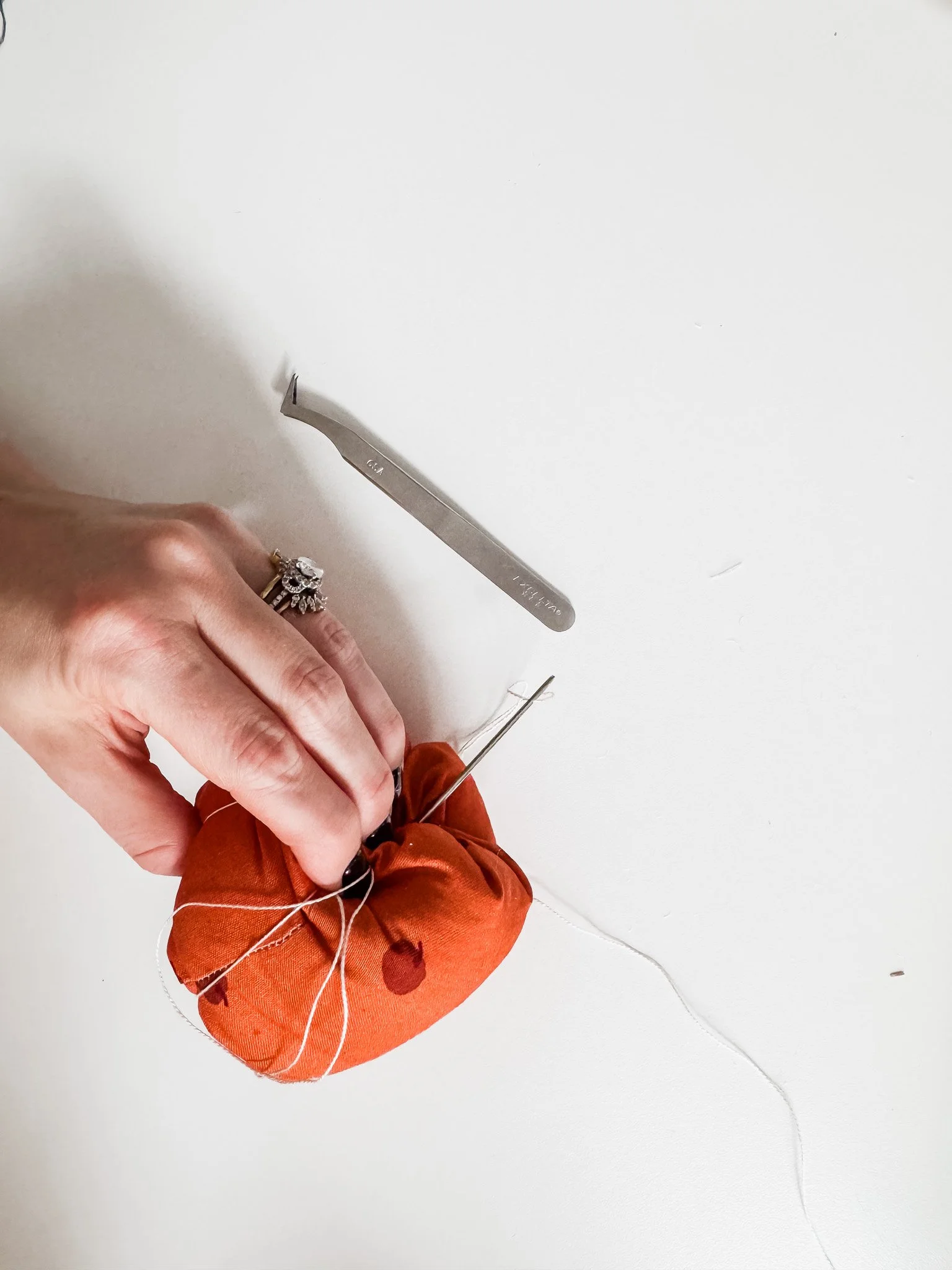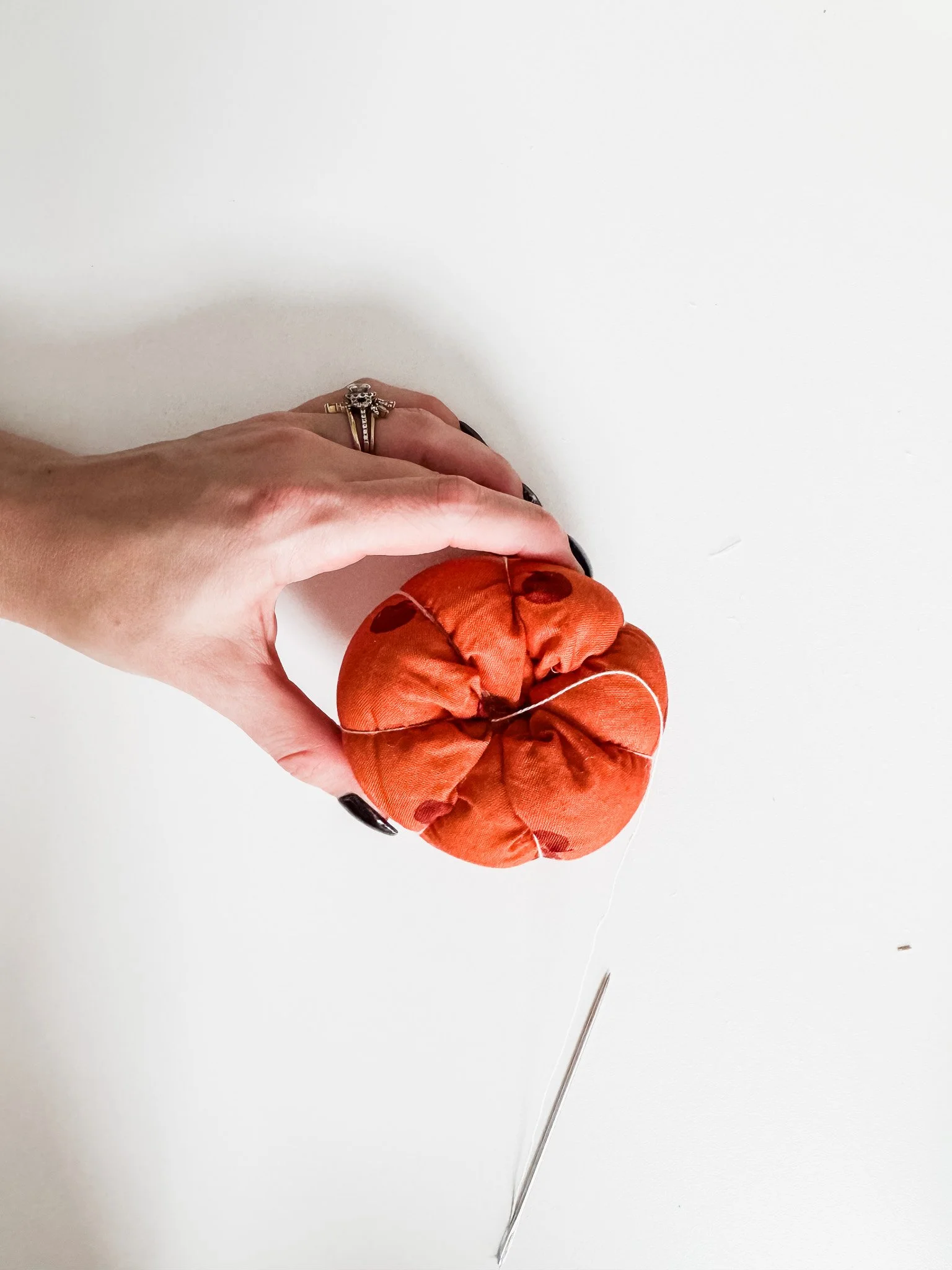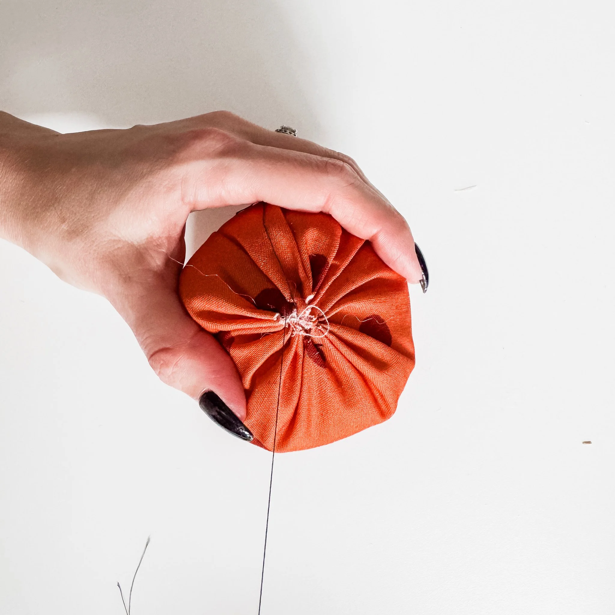 Starting at the bottom center, push the needle up through the middle to the top. Pull gently to create that pumpkin “squish,” then wrap the thread over the outside and go back down. This can be tricky - just go slow and keep some good pressure on the pumpkin. Using pliers can help grip the needle to pull it through.