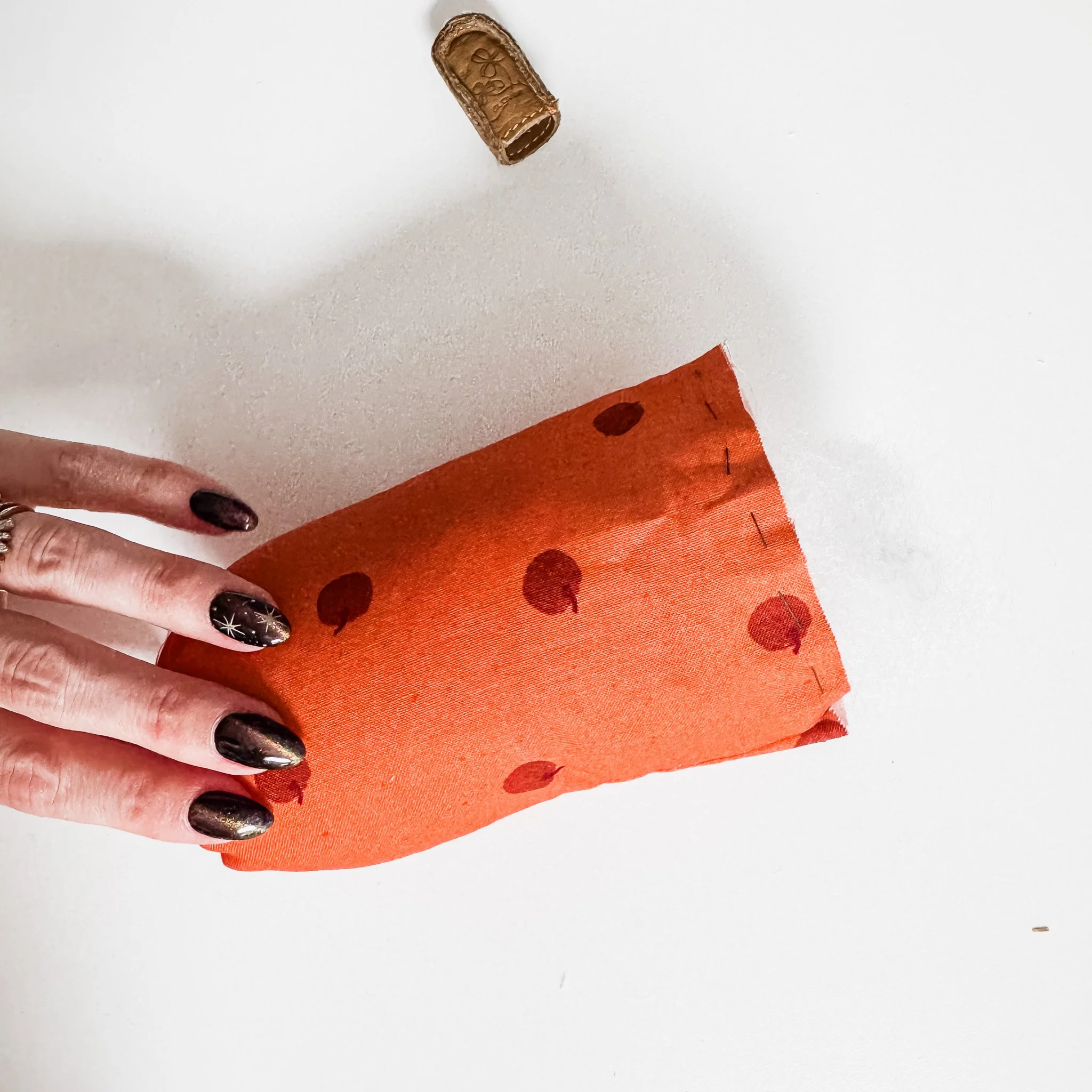Glue or insert a small stick (or a cinnamon stick!) into the top for the stem. My pumpkin tops have a bit of a hole in the top where the gathering stitches don’t fully close; carefully wiggling your stick into this hole and then gluing it in place is a good approach.