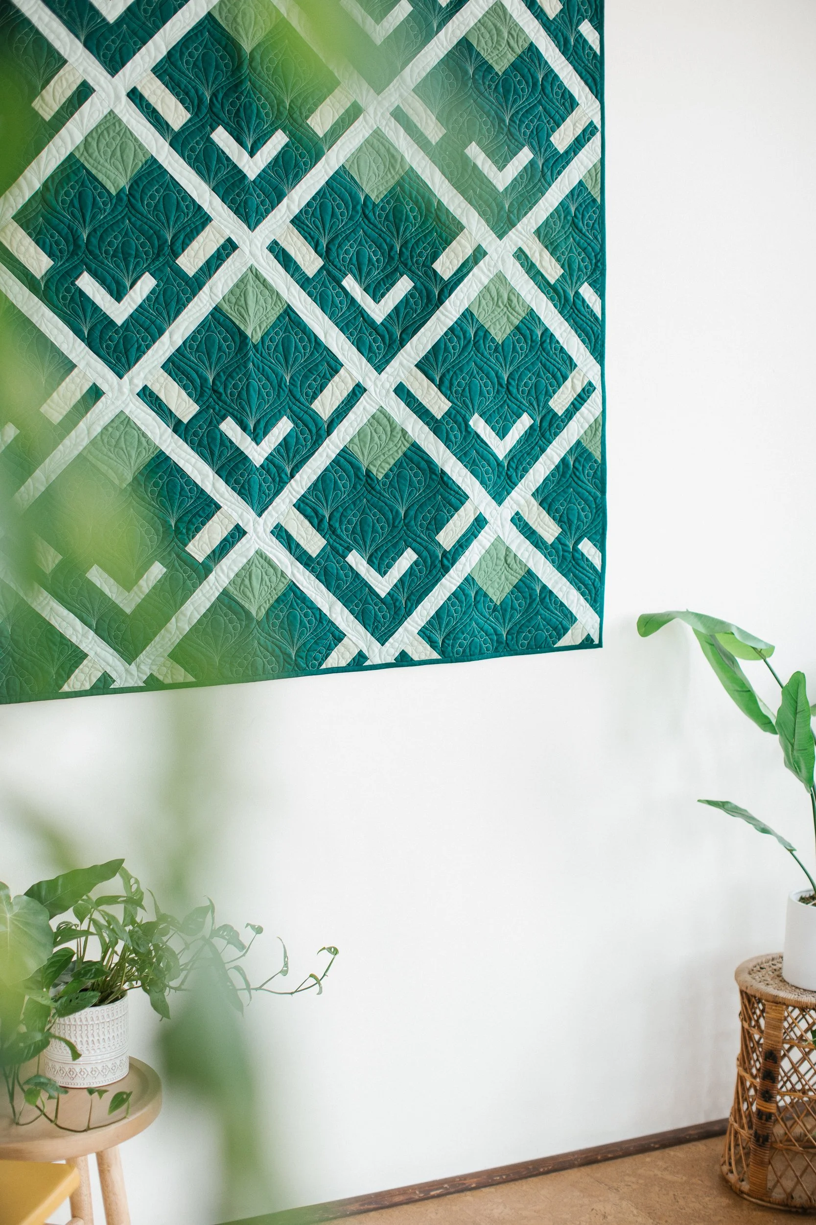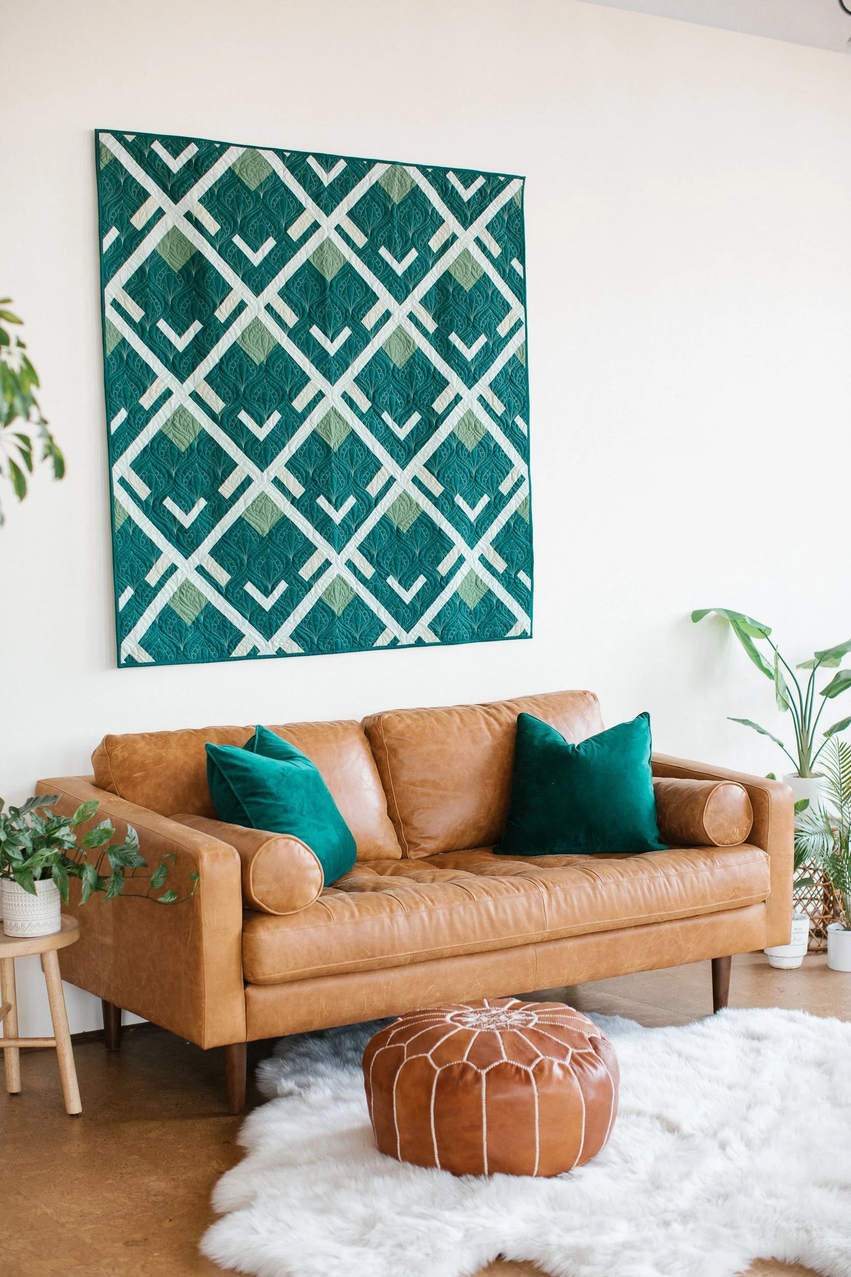 This modern quilt was designed for my sister and was inspired by a series of mountains in one of my favorite locations in Oregon: the Three Sisters. Made with linen, cotton, and lightweight wovens and quilted with a wavy design, this quilt will bring a cozy modern feel to your home.